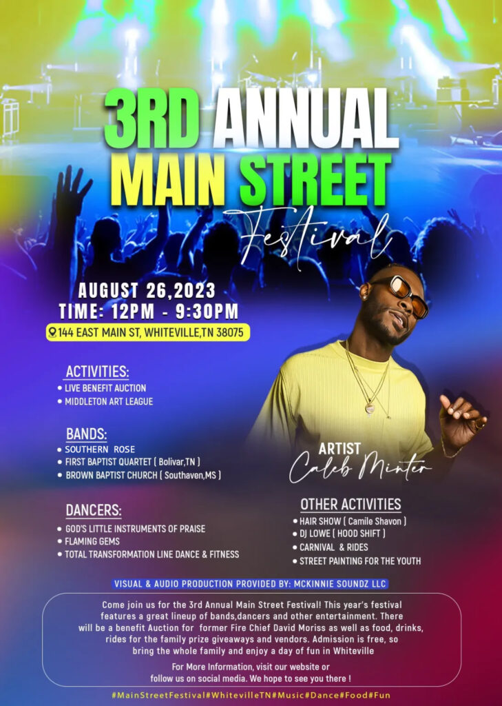 The Town of Whiteville is excited to announce its 3rd Annual Main Street Festival will be held on Saturday, August 26, 2023, from 12 p.m. to 9:30 p.m. The festival this year features a great lineup of bands, dancers, and other entertainment.