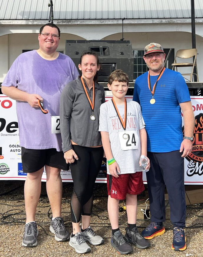 The Carl Perkins 5K Boo Run and Fun Run winners pictured (l – r): Chris Burkeen, Andrea Jones, Mason McDonald, and Justin Jones.