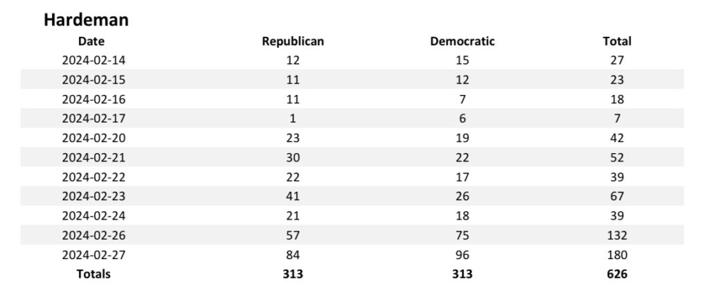 Early voting ended earlier this week with 626 individuals casting a ballot in Hardeman County in the Presidential Preference Primary and County Primary Election. The voters were exactly evenly split in their preference of which primary to vote in with 313 voting in the Republican Primary and 313 voting in the Democratic Primary. The numbers from early voting include in-person early voters, absentee by-mail ballots submitted by voters, and voters at licensed facilities.