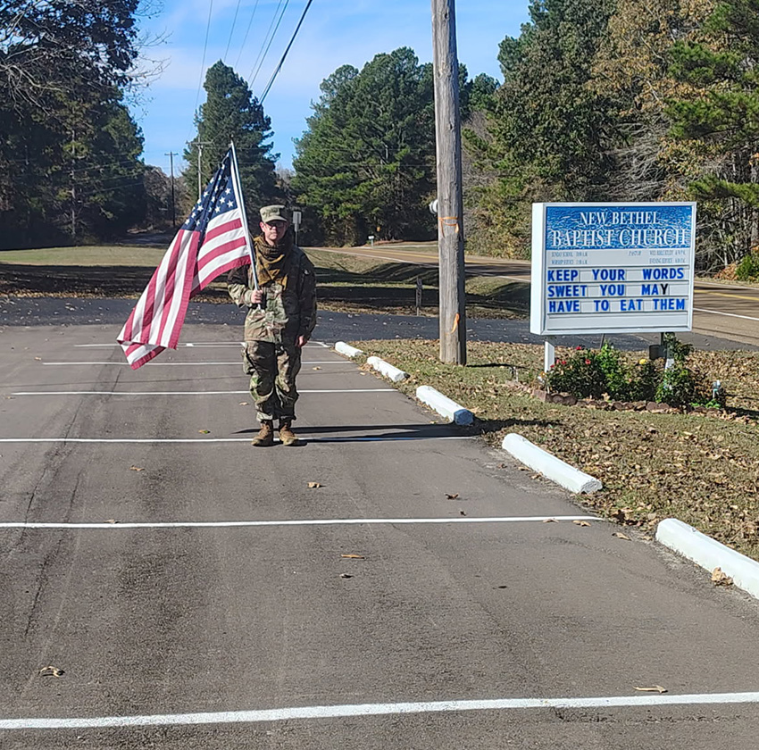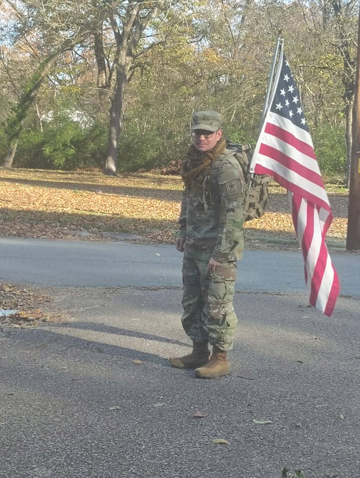 Cody set out that morning on a personal mission to show his gratitude and respect to veterans and to appreciate everything around him. The plan was to walk from his home in Middleton and finish where his great-grandfather was laid to rest in the New Bethel Baptist Church Middleton cemetery. A drive, which normally takes less than 10 minutes in a car, is an approximate two hour and six-minute trek on foot. Cody’s monthly drill training with the Army National Guard prepared him to push through the cold and windy 28-degree temperature and the long journey ahead.