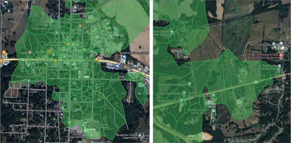 If you live in any of the highlighted green areas shown on the maps and are interested in high speed Internet service, contact Aeneas to learn more. Call (731) 554-9200 and choose option 1 to place your order and get your account started.