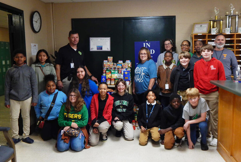Area Hardeman County Schools, which included Bolivar Middle School (BMS), Grand Junction Elementary School, Hornsby Elementary School (HES), Middleton Elementary School (MES), and Whiteville Elementary School, collected non-perishable food items to donate to Loaves and Fishes for the non-profit organization’s annual food drive. Each year during the Thanksgiving holiday season, Loaves and Fishes holds its food drive providing an opportunity for county schools to partner with the food pantry to help keep its shelves full during one of its busiest seasons of the year.