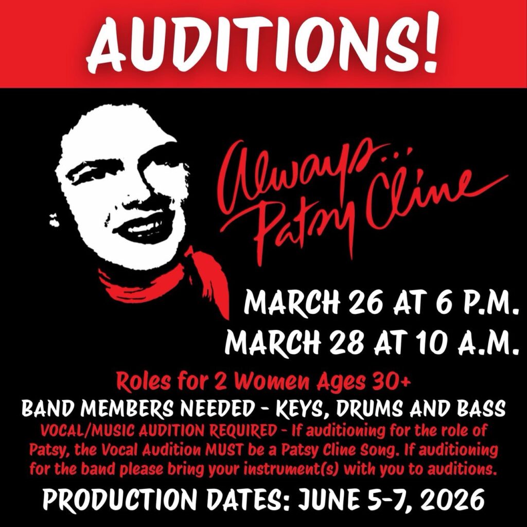 Vocal/Music audition required – If auditioning for Patsy, your vocal audition must be a Patsy Cline song. If auditioning for the band, please bring your instrument(s).