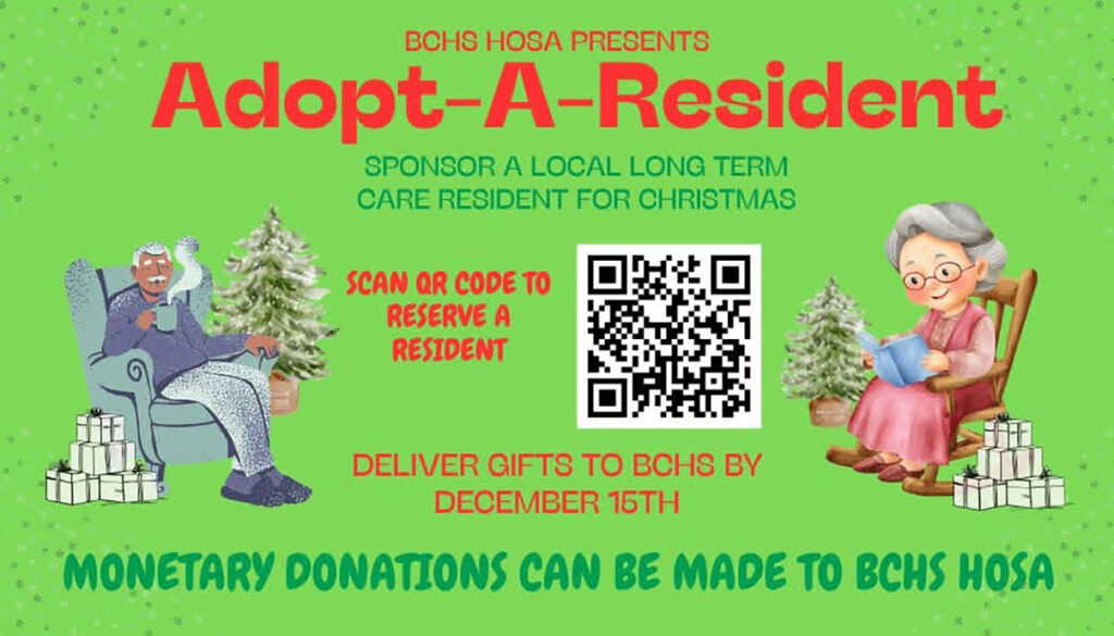 On the program website, attached to each resident, is a list of wants and needs. Once someone adopts the resident, they are responsible for putting together a Christmas gift for the resident. Gifts should be brought to BCHS by Monday, December 15, 2025. HOSA members will then deliver them to the local nursing homes on Wednesday, December 17, 2025.