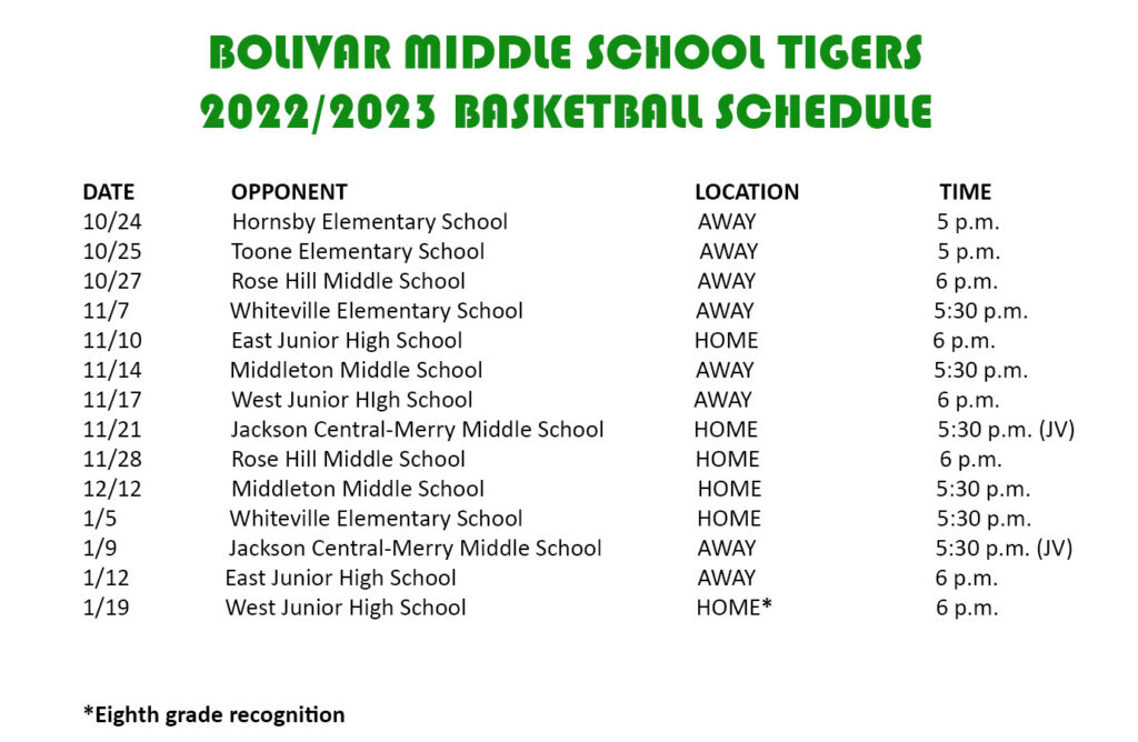 Bolivar Middle School (BMS) released its 2022/2023 basketball schedule with its first listed game being played away against Hornsby Elementary School on Monday, October 24, 2022, at 5 p.m. The BMS Tigers are a district 2A area 18 team. Read to learn more about the 2022/2023 team.