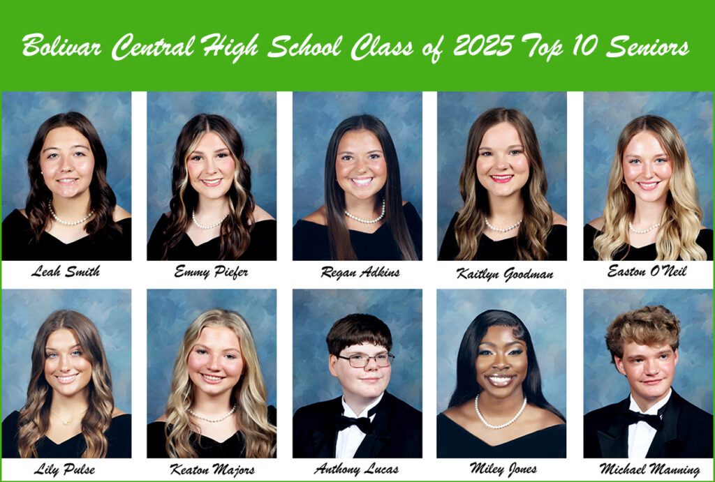 Bolivar Central High School announced its Top 10 Seniors for the Class of 2025. The students who were recognized are listed in the order of their rank as Valedictorian Leah Smith, Salutatorian Emmy Piefer, Regan Adkins, Kaitlyn Goodman, Easton O’Neil, Lily Pulse, Keaton Majors, Anthony Lucas, Miley Jones, and