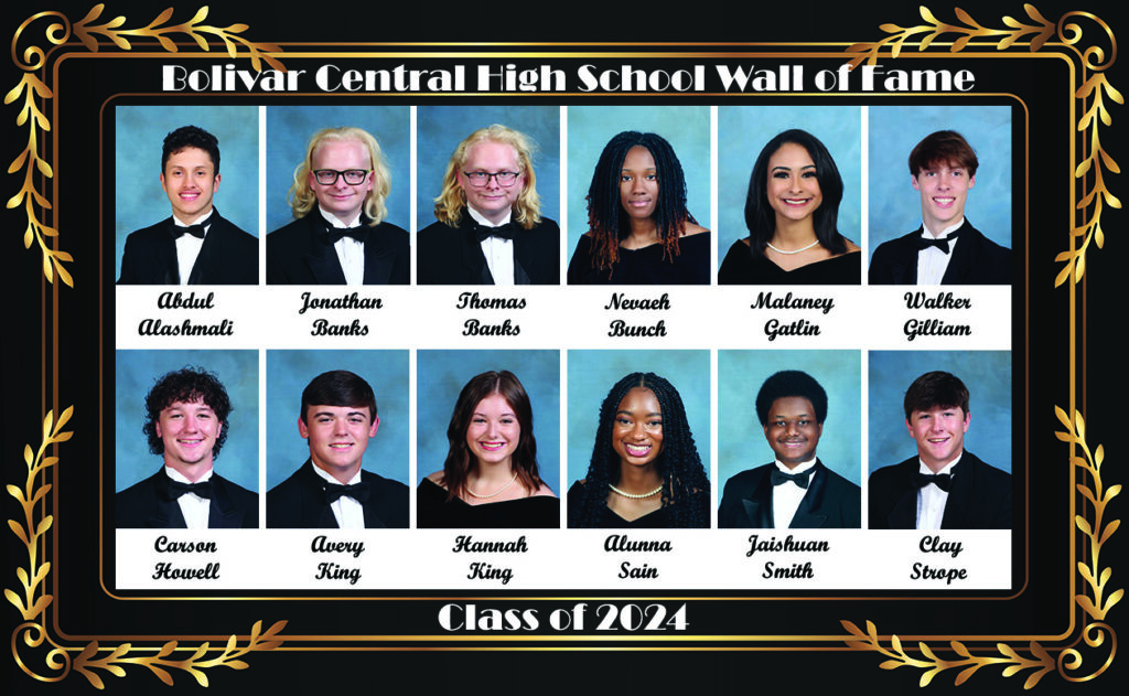 Bolivar Central High School (BCHS) announced its 2024 Wall of Fame Seniors as Abdul Alashmali, Jonathan Banks, Thomas Banks, Nevaeh Bunch, Malaney Gatlin, Walker Gilliam, Carson Howell, Avery King, Hannah King, Alunna Sain, Jaishuan Smith, and Clay Strope.