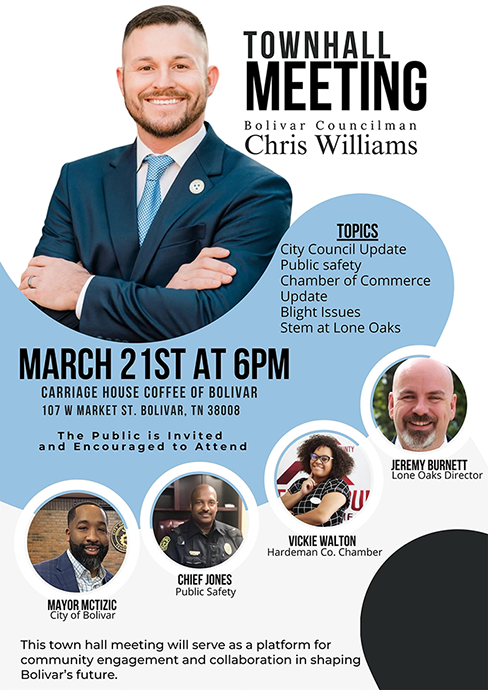 Bolivar City Councilman Chris Williams will hold his first Town Hall Meeting of the year on Thursday, March 21, 2024, at 6 p.m. at Carriage House Coffee in Bolivar. The goal of the meeting is to serve as a platform for community engagement and collaboration in shaping Bolivar’s future.