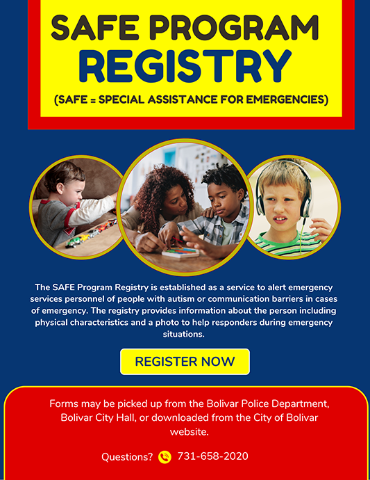 If you are the parent, guardian, or caregiver of someone with autism or other communications barriers, including a mental health disorder, you may complete a registration form. The SAFE Program Registry form is available in person at the Bolivar City Hall { 211 North Washington Street, Bolivar, 38008}  and Bolivar Police Department { 211 West Jackson Street, Bolivar, 38008 }, and online on the City of Bolivar website.
