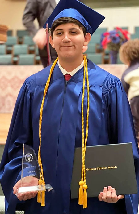 Jacob Eric Bryce Lewis, age 15 of Bolivar, graduated from Gateway Christian Schools (GCS) as class valedictorian, with English honors, on Friday, January 31, 2025. He was one of 74 students, recognized during a graduation ceremony, which was held in Memphis at Leawood Baptist Church.