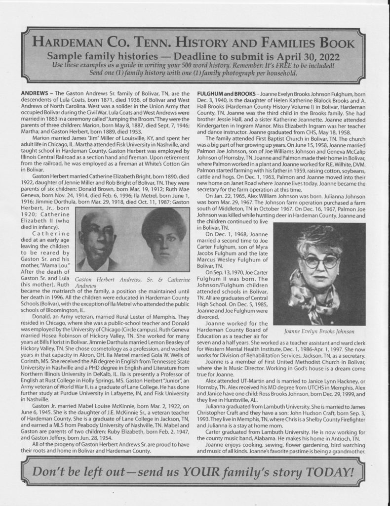 Submissions for the Hardeman County History and Families, Vol. III – Bicentennial Edition will be accepted through November 15, 2022. You may send your submission and make presale book orders directly through Acclaim Press, which is publishing the edition.