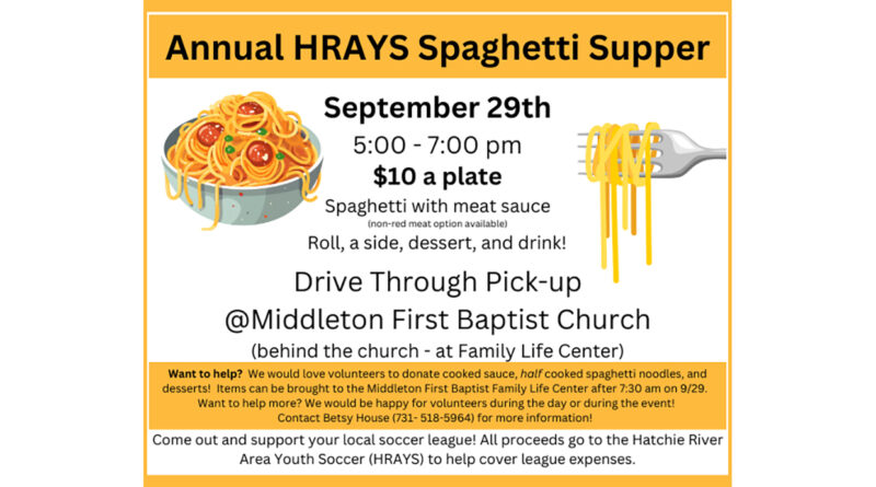 Read MoreThe Hatchie River Area Youth Soccer (HRAYS) is making plans for its HRAYS Spaghetti Supper fundraiser that will be held