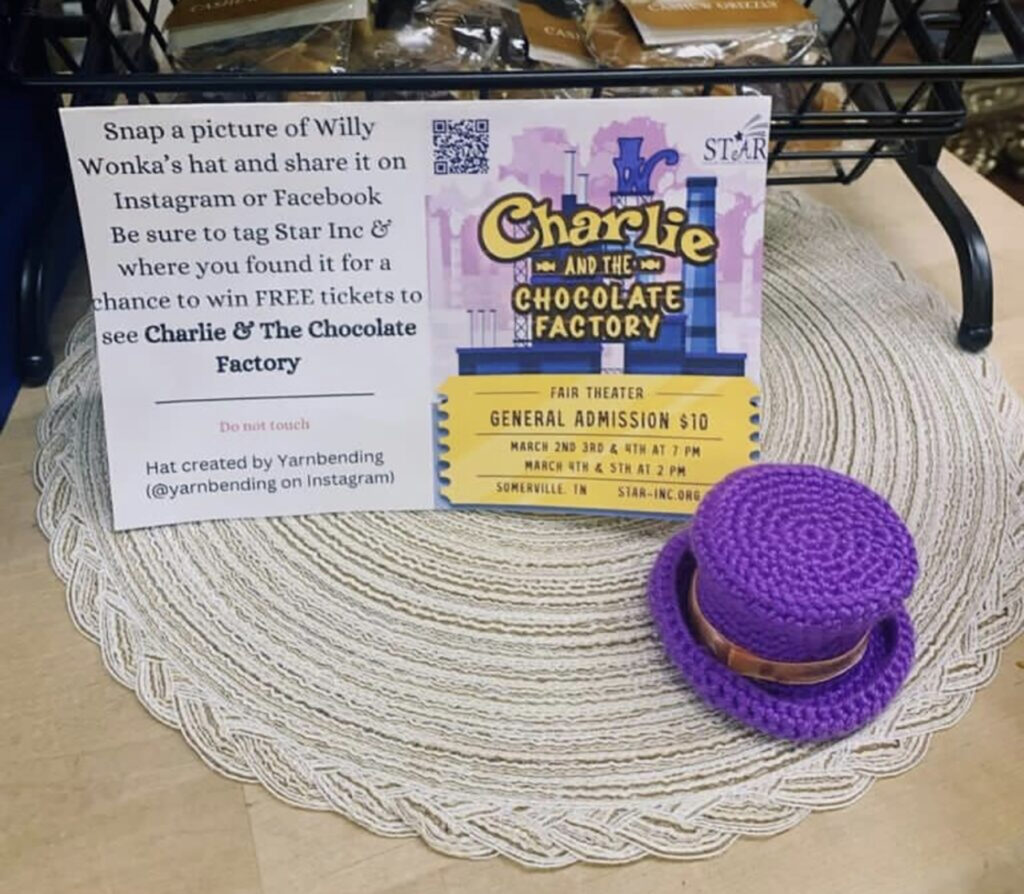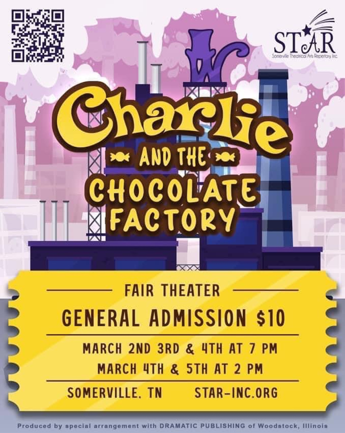 Star, Inc. presents Charlie and the Chocolate Factory Thursday through Sunday, March 2 – 4, 2023, at 7 p.m. and Saturday and Sunday, March 4 – 5, 2023, at 2 p.m. at the Fair Theater in Somerville. You may purchase tickets online or at the Star, Inc. box office one hour before each performance. The Fair Theater is located at 116 East Market Street, Somerville, Tennessee 38068.