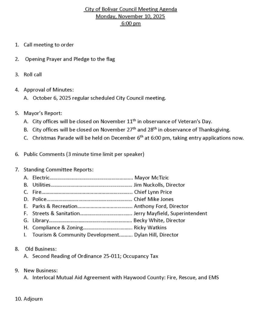 The City of Bolivar held its monthly City Council Meeting on Monday, November 10, 2025.