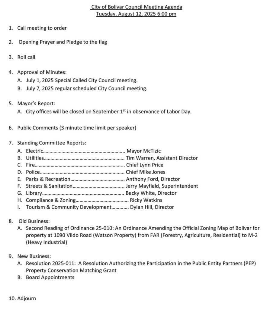 The City of Bolivar held its monthly City Council Meeting on Tuesday, August 12, 2025. Several items were discussed. You may read the agenda and watch the full meeting below.