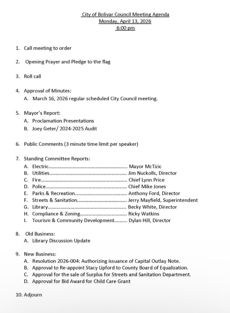 The City of Bolivar held its monthly City Council Meeting on Monday, April 13, 2026.