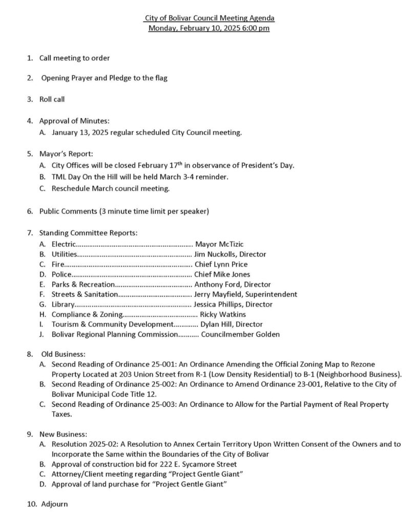 The City of Bolivar held its monthly City Council Meeting on Monday, February 10, 2025. Several items were discussed. You may read the agenda and watch the full meeting below.