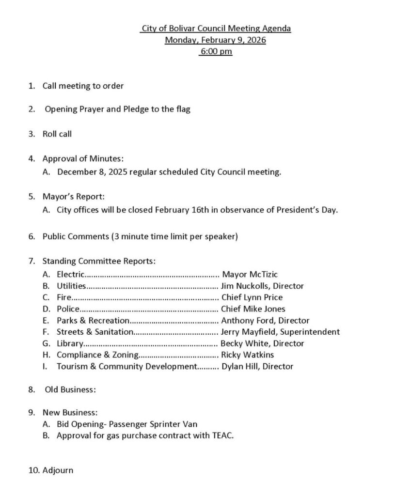 The City of Bolivar held its monthly City Council Meeting on Monday, February 9, 2026.