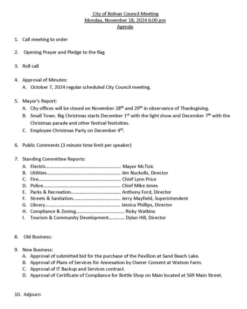The City of Bolivar held its monthly City Council Meeting on Monday, November 18, 2024. Present were Mayor Julian McTizic and Council members Mike Brown, Melvin Golden, Larry McKinnie, Caroline Miller, Suzanne Rhea, Chris Williams, and Tommy Woods. Councilman Todd Lowe was absent.