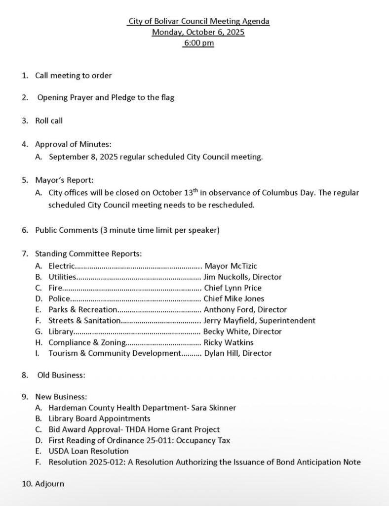 The City of Bolivar held its monthly City Council Meeting on Tuesday, October 6, 2025. Present were City Council members Michael Brown, Todd Lowe, Larry McKinnie, Caroline Miller, Suzanne Rhea, Chris Williams, Tommie Woods, and Mayor Julian McTizic. Melvin Golden was absent. Several items were discussed. You may read the agenda and watch the full meeting below.