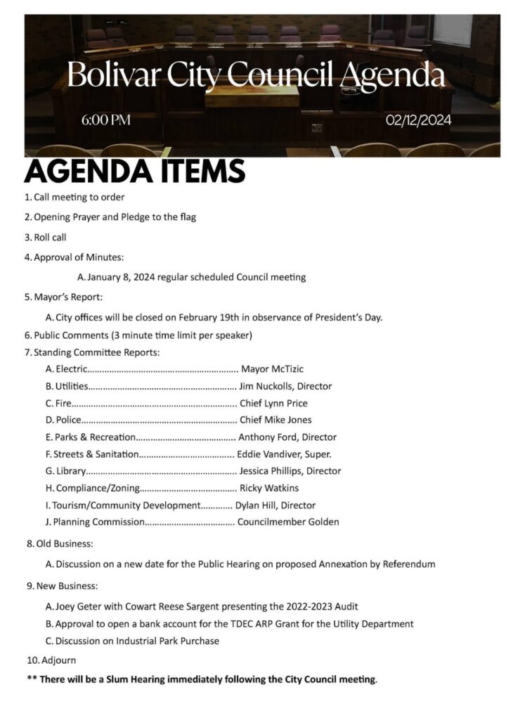 The City of Bolivar held its monthly meeting on Monday, February 12, 2024. Several items were discussed. You may read the agenda and watch the full meeting below.