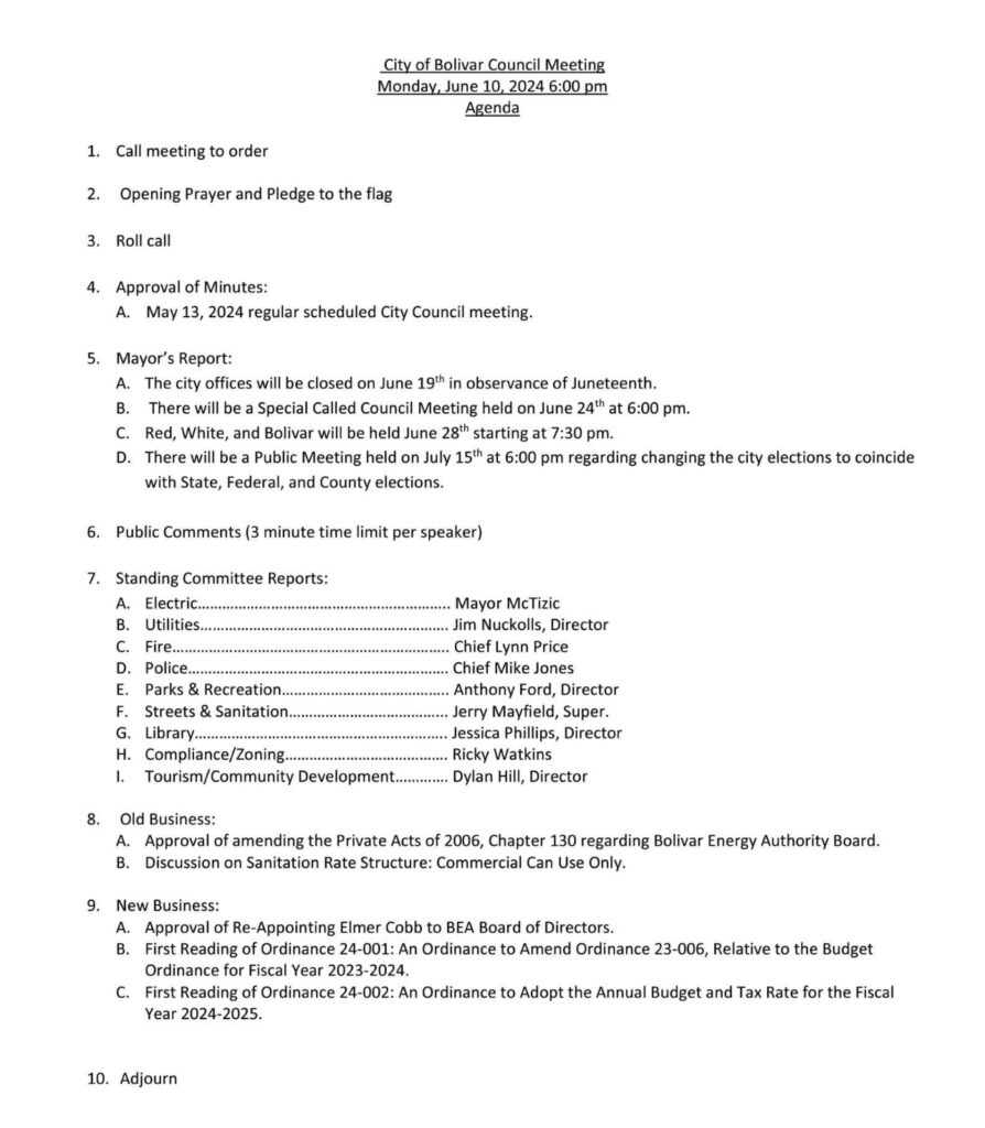 The City of Bolivar held its monthly meeting on Monday, June 10, 2024. Several items were discussed. You may read the agenda and watch the full meeting below.
