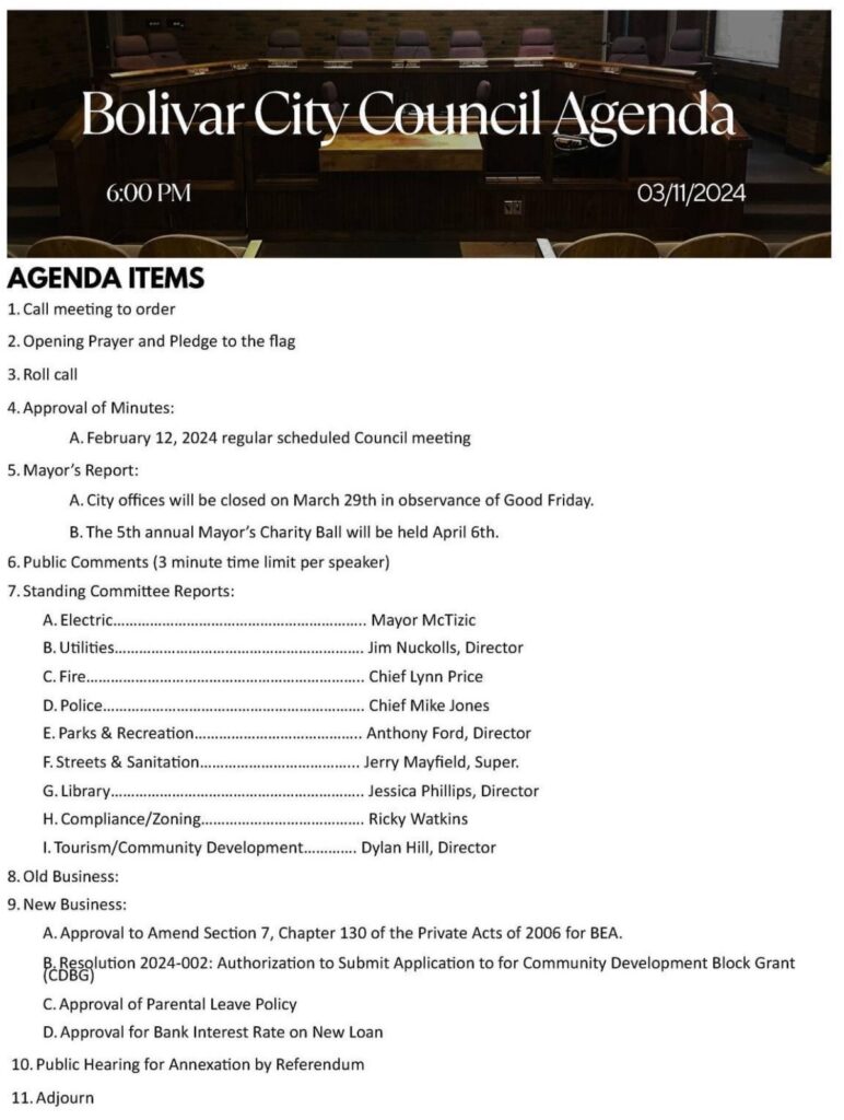 The City of Bolivar held its monthly meeting on Monday, March 11, 2024. Several items were discussed. You may read the agenda and watch the full meeting below.
