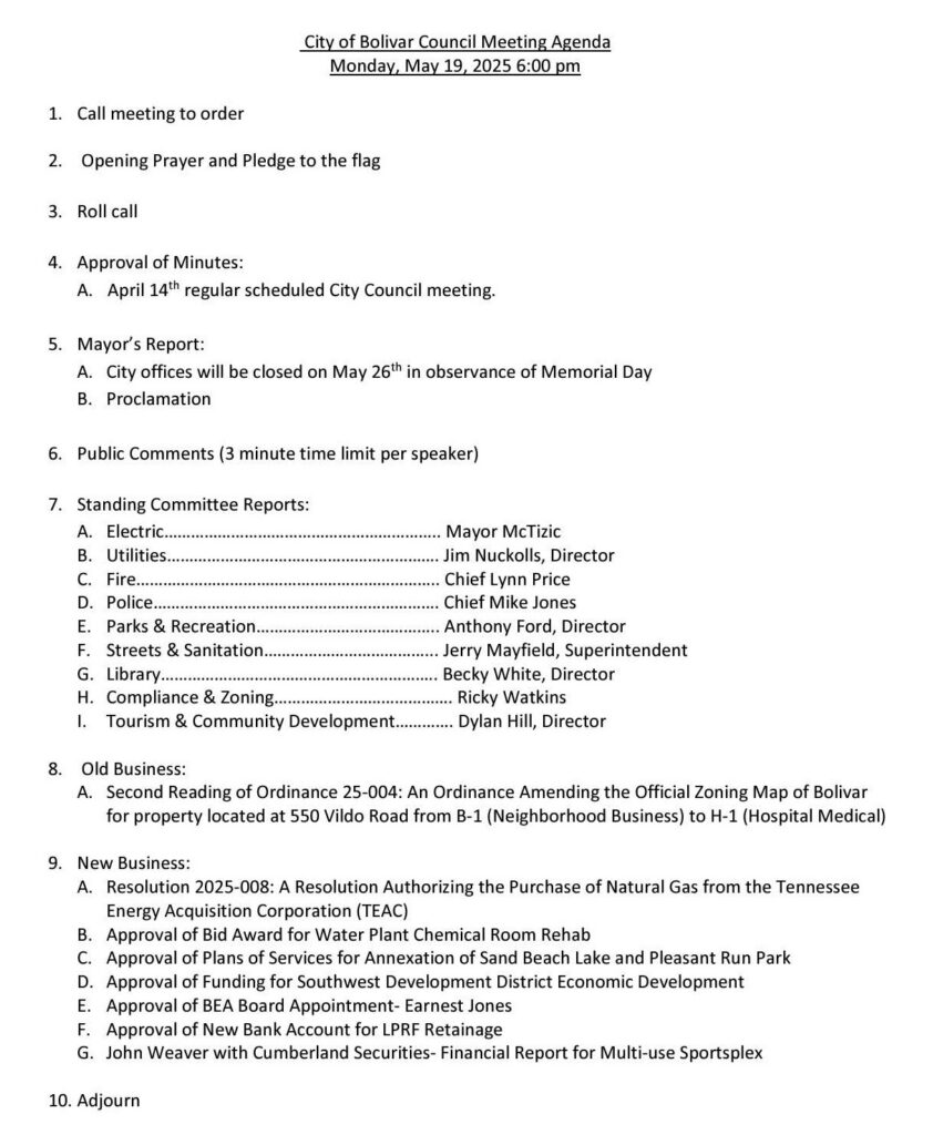 The City of Bolivar held its monthly City Council Meeting on Monday, May 19, 2025. Several items were discussed, including funding for the proposed multi-sport complex. You may read the agenda and watch the full meeting below.