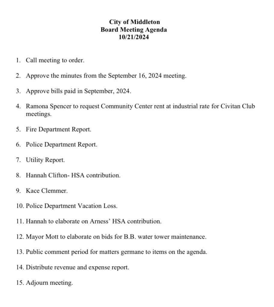 The City of Middleton Mayor and Board of Aldermen met on Monday, October 21, 2024, for its regular monthly meeting. The agenda is shown below of the issues that were covered during the meeting. You may watch the full meeting video below and also on the Hatchie Press YouTube channel.