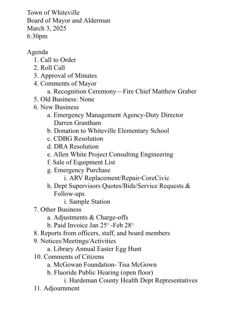 The Town of Whiteville held its monthly meeting on Monday, March 3, 2025. Several items were discussed. You may read the agenda and watch the full meeting below.