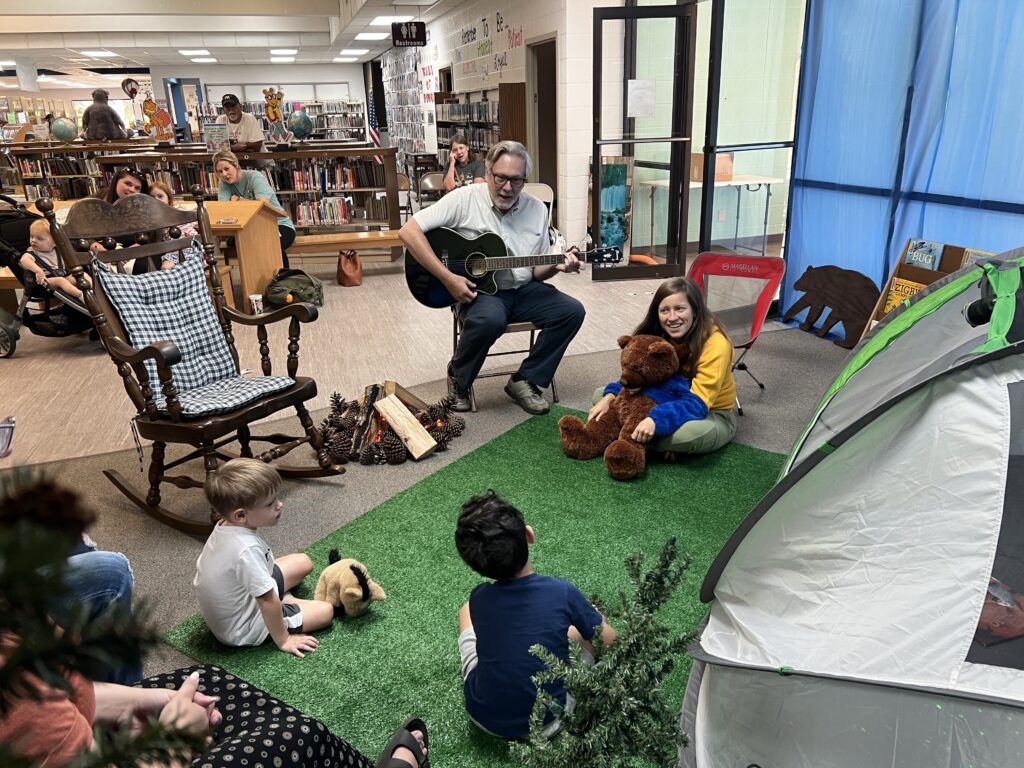 Hardeman County Commissioner Johnny Weems, who also serves on the Bolivar-Hardeman County Library Board, joined in the children’s story-time last week by leading campfire songs at the Bolivar-Hardeman County Library. The library is celebrating fall and went all out with its camping theme, which includes a tent, campfire and waterfall for children to explore.