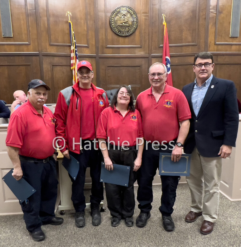 Four members of the Hardeman County Emergency Medical Services (HCEMS) department were recognized with a certificate of appreciation at the Hardeman County Commission meeting on Tuesday, February 21, 2023, for their 30 years of service. Matthew Ernst, Kim Hines, Tommy Parchman, and Harvey Vandiver stood at the meeting and were applauded by some of the citizens they serve in Hardeman County. Hardeman County Commissioner Bethany Miller and Hardeman County Mayor Todd Pulse presented Ernst, Hines, Parchman, and Vandiver with their certificates.