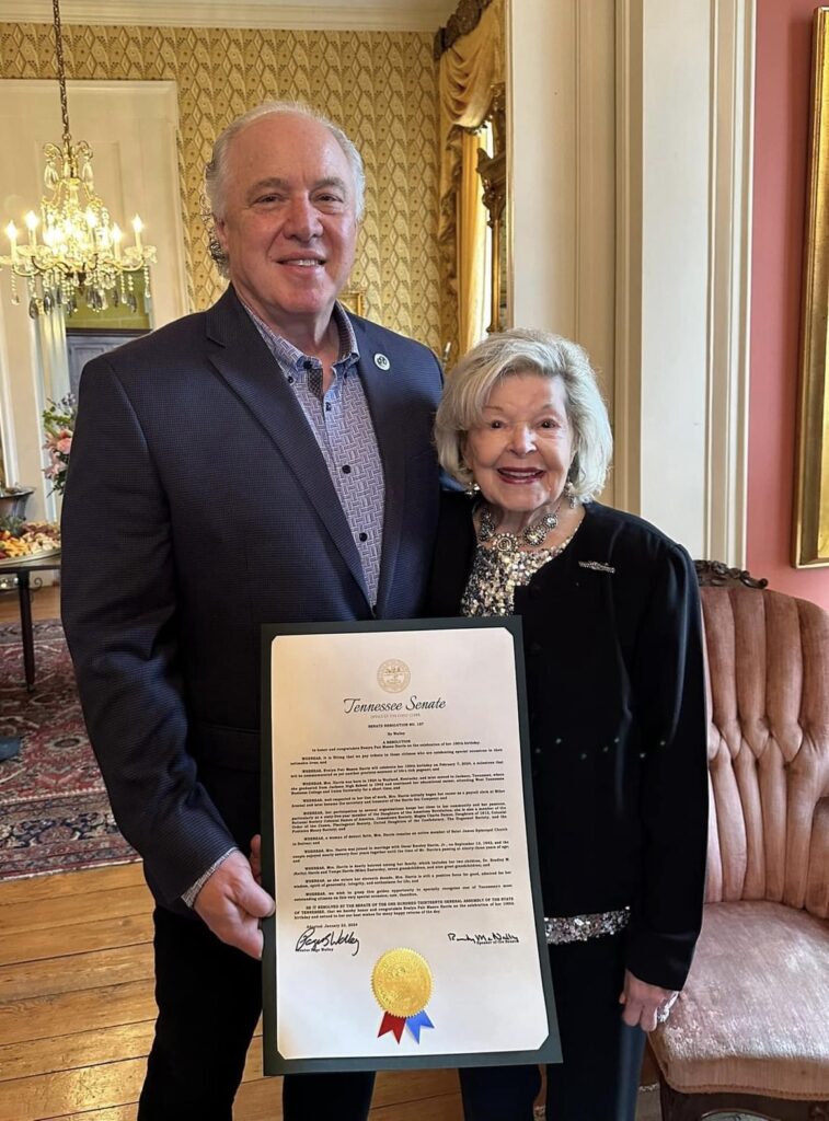 Mrs. Harris celebrated her 100th birthday on February 7, 2024, in what Senator Page Walley referred to as, “a milestone that will be commemorated as yet another precious souvenir of life’s rich pageant”.