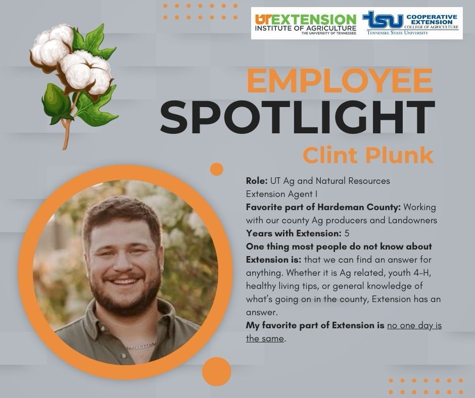 March is recognized as Extension Month, a time to highlight the impact of local Extension offices and the individuals who provide research-based education and resources to their communities. The UT–TSU Extension Office in Hardeman County is proud to spotlight Clint Plunk, Agriculture and Natural Resources Extension Agent.