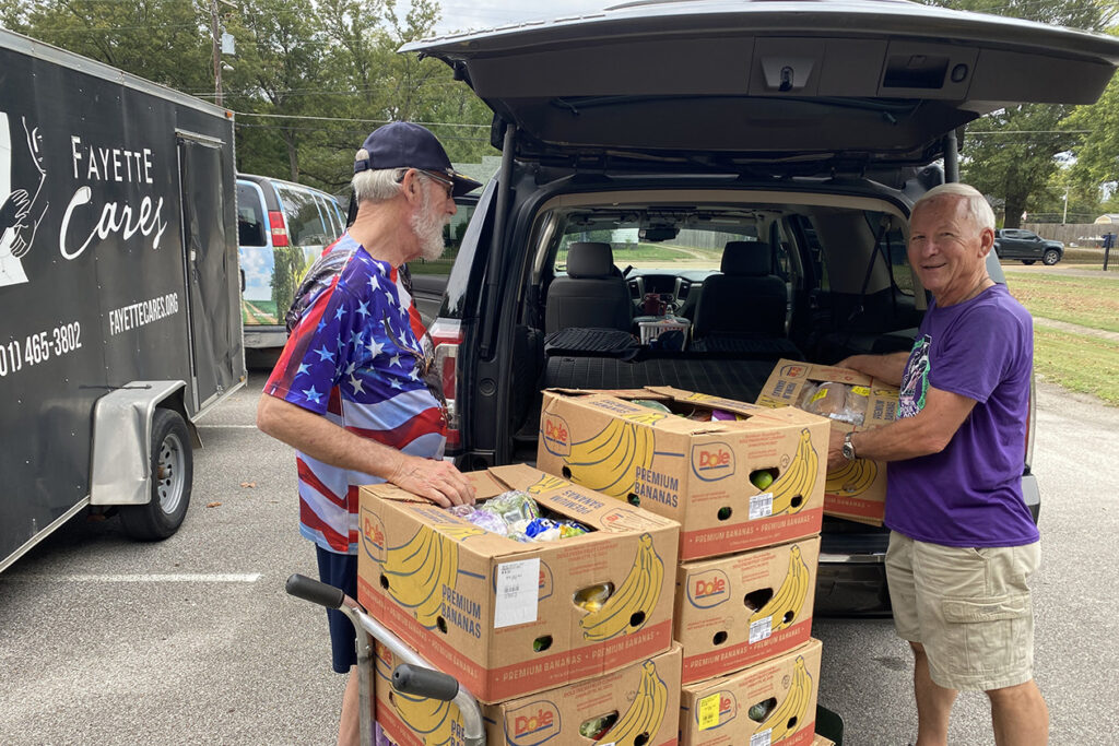 Fayette Care volunteers Wayne Drake and Phil Lemoine Unloading Produce for Food Panty Aid in anticipation of an increased need for food aid.