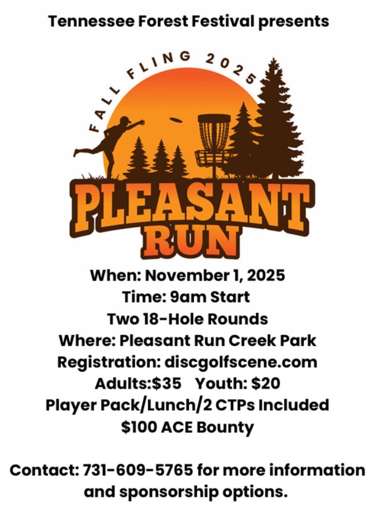 For more information about the Pleasant Run Fall Fling or local disc golfer group, contact Brittney at (731) 609-5765.