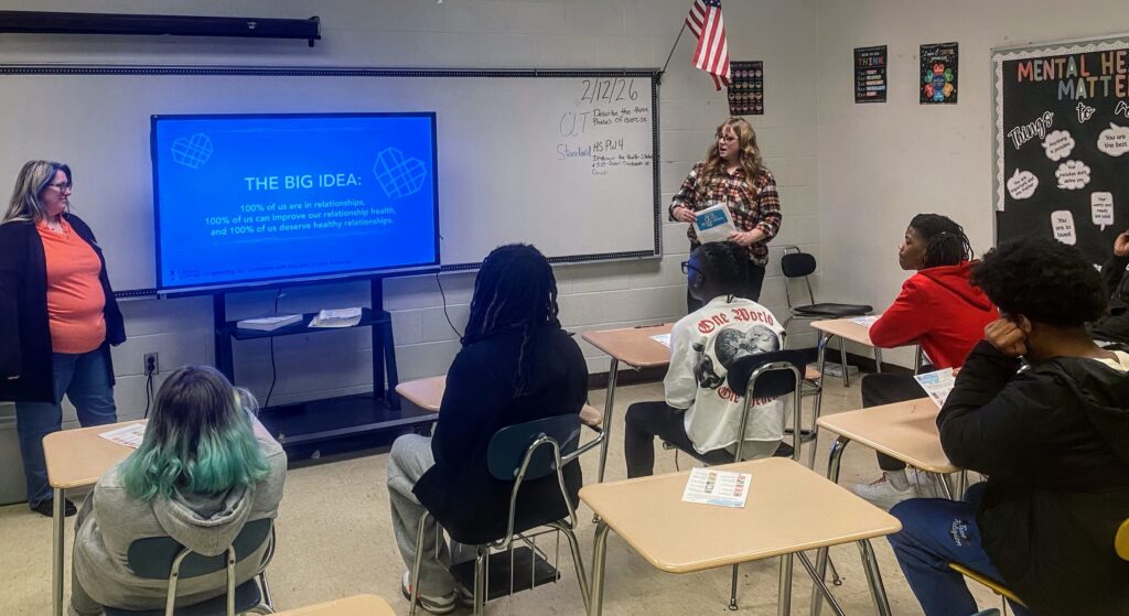 In February, during Teen Dating Violence Awareness Month, Luthe and Wilson led six interactive sessions at Fayette-Ware Comprehensive High School focused on recognizing healthy and unhealthy relationship behaviors, understanding consent, and knowing how to seek help safely.