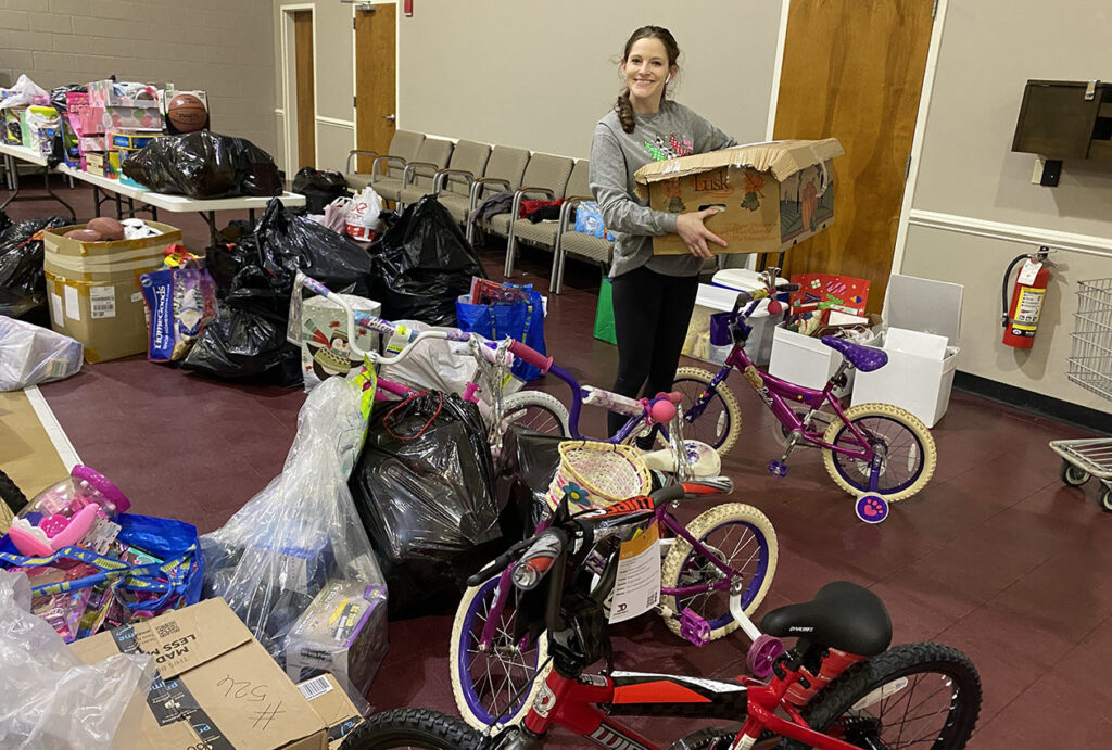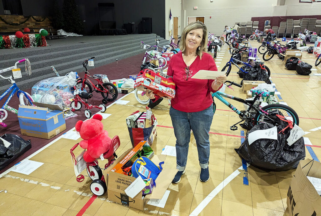 Fayette Cares volunteer Donna Winfrey helping to distribute toys to Angel Tree children inside of Warren Community Church’s gymnasium.