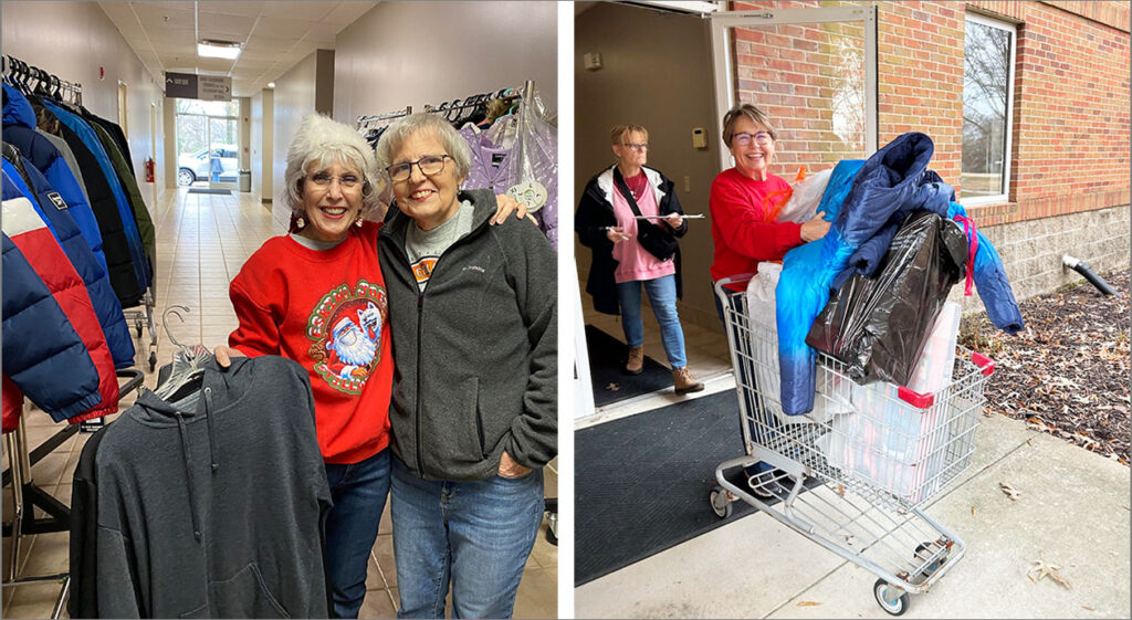 Pictured (l t r): Fayette Cares volunteers Wendy Johnston (left) and Jane Mitchell (right) checking to make sure the size is just right for each child receiving a coat donated by the Knights of Columbus and other caring donors. Fayette Cares Board President Debbie Sullivan delivering a cart full of presents and new jackets to an angel tree recipient.
