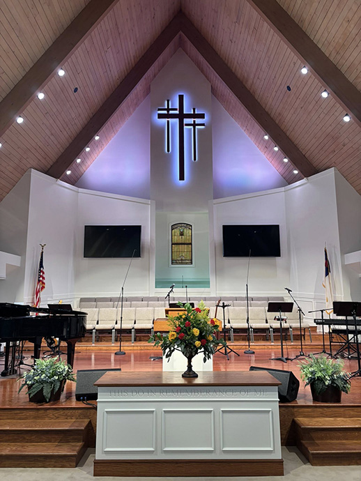 During the renovation, FBC did not allow the work to stall its ministry and held its services at the Hardeman County Arts Center in Bolivar. The renovation allowed the church to make several upgrades, some which included audio and visual tech and lighting. Although the floor plan and layout are the same, worshiping in the sanctuary which seats more than 300 people is a more pleasant and beautiful experience.