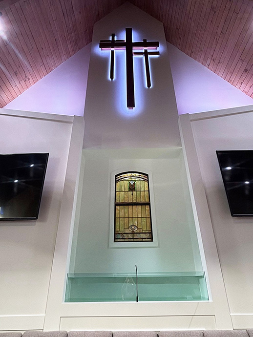 A special feature connecting the old to the new was the addition in the baptistry of one of the stained-glass windows from the FBC church, which was previously located uptown in Bolivar.