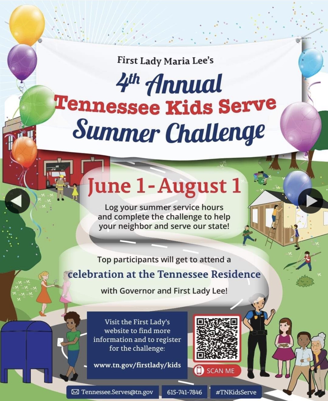 Tennessee First Lady Maria Lee has announced the launch of the fourth annual Tennessee Kids Serve Summer Challenge.