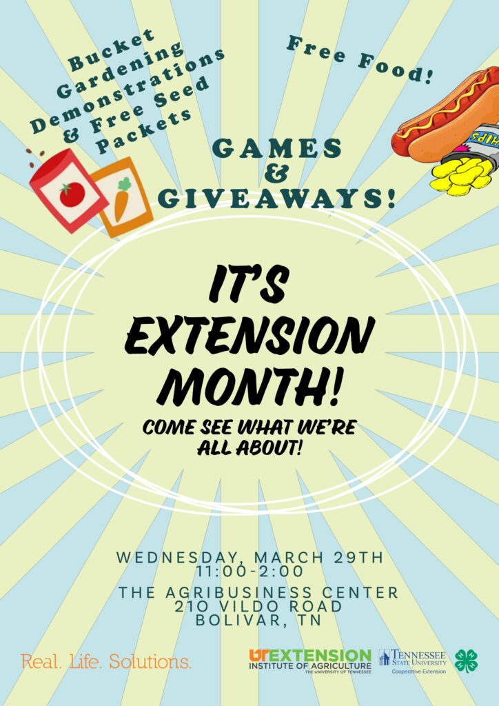 March is Extension Month in Tennessee and to celebrate, the Hardeman County UT Extension office will hold an open house on Wednesday, March 29, 2023, from 11 a.m. to 2 p.m. Free food, giveaways, demonstrations, door prizes, and more will be available. The Extension office is located at the Agribusiness Center, 210 Vildo Road in Bolivar.