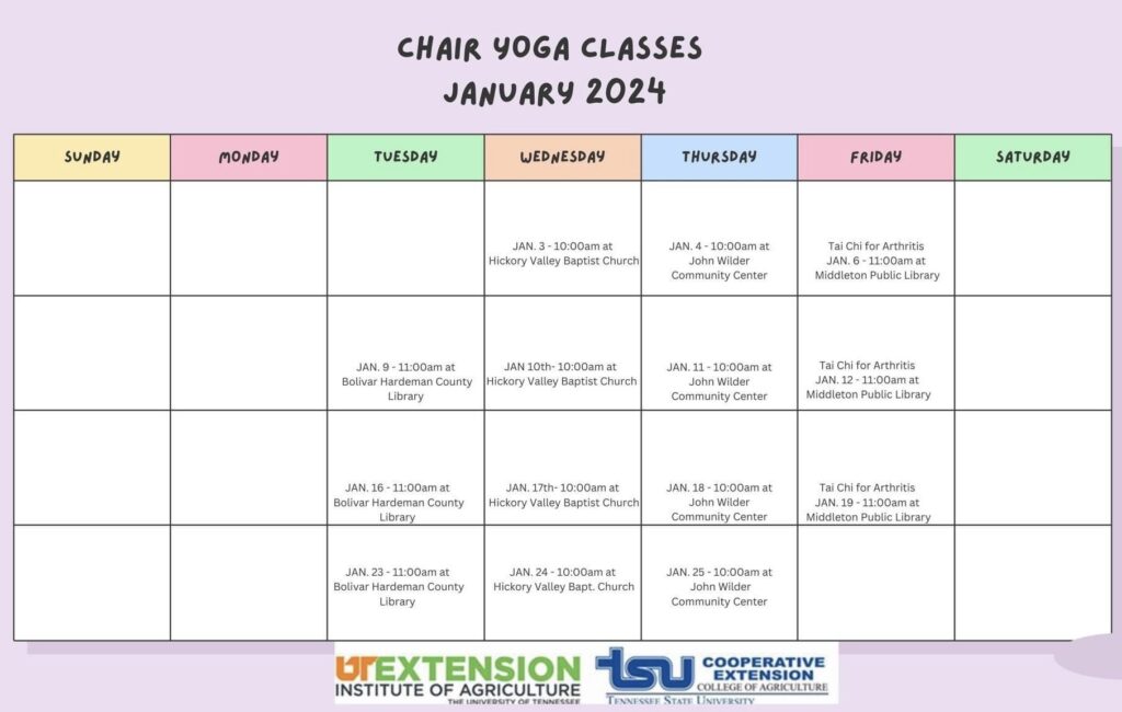 Bolivar Hardeman County Library – Chair yoga classes will be held on Tuesdays, January 9, 16, and 23, 2024, at 11 a.m.