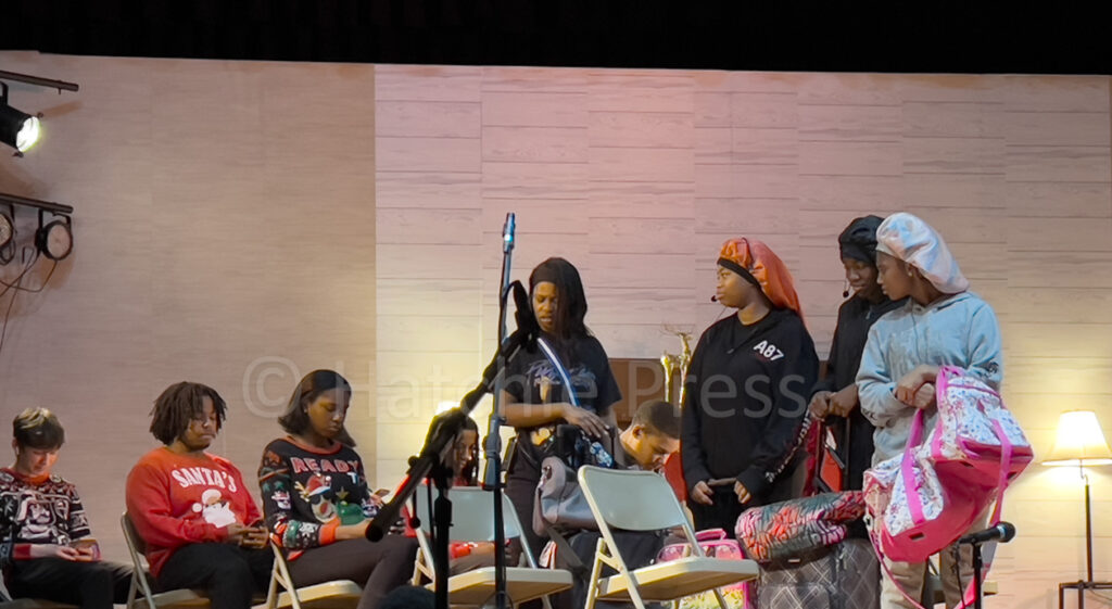 The students started working on the Girls Trip production in October. Griggs noted the color guard put in extra time to perfect the routines and acting to present a great show for their family, friends, and the community. Band and choir members Aiden Byrd (played Airline Security), Avery King (played Pilot Voice and Announcer), and Jayden Wilson (played Caroler Leader), stepped into acting roles. Other scenes from the production included dance and lip sync performances by the color guard, and a shoutout tribute to BCHS student Kemia McClellan (#Kemialivin), who passed away in October 2023. It was performed to Kemia’s favorite song, “Can We Talk”, by Tevin Campbell.