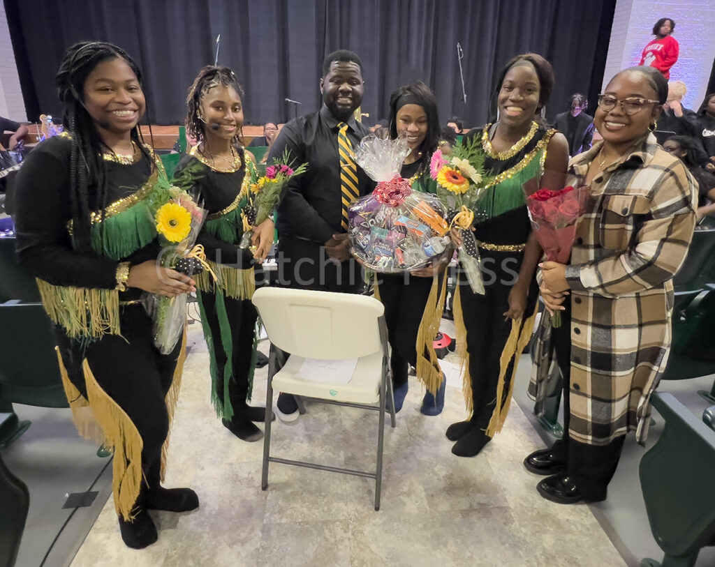 After the final performance of Girls Trip, Mr. Griggs’ students presented him with a gift basket. Pictured (l to r): Ca’Maiyah Tucker, Hope Marcell, Mr. Griggs, Alexis Dotson, Jasmine Horton, and Mr. Griggs wife, JohnBernae (Hudson) Griggs.