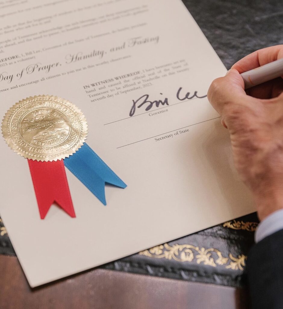 Tennessee Governor Bill Lee has signed a proclamation dedicating today, October 13, 2023, as a Day of Prayer & Fasting across Tennessee.