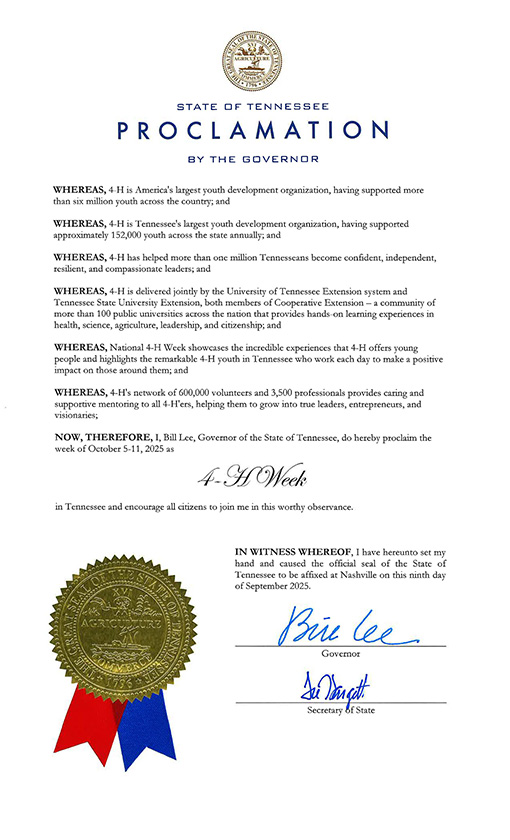 Governor Bill Lee proclaimed October 5-11, 2025, as 4-H Week in the State of Tennessee. in the proclamation, he noted the youth development organization has “supported more than six million youth across the country; and . . . has supported approximately 152,000 youth across the state annually. Even closer to home in Hardeman County, 4-H has supported hundreds of youth from area schools.