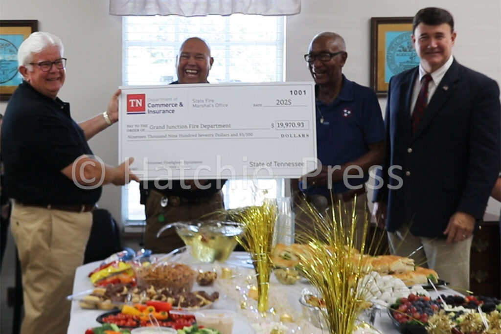Hardeman County Mayor Todd Pulse and Representative Johnny Shaw presented Grand Junction Mayor Curtis Lane with a $19,970.33 check for its City fire department from the Tennessee Department of Commerce and Insurance on Monday, September 29, 2025. The City of Grand Junction was the recipient of the grant which was awarded to fire departments and rescue squads across the state to help with equipment and training purposes.
