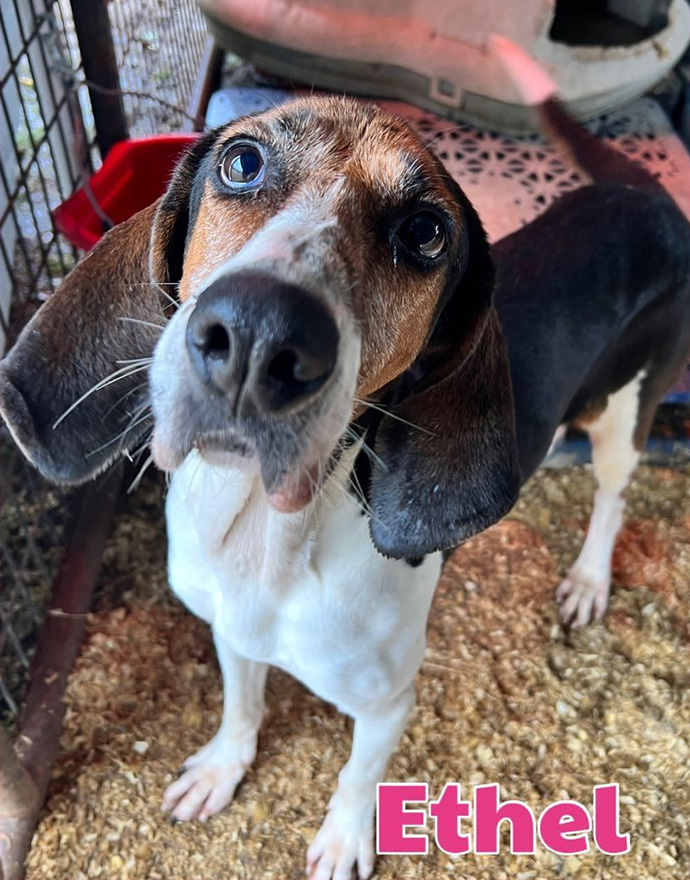 Ethel is a sweet, happy, goofy four year old hound. She weighs 45 pounds and likes to play with other dogs. Ethel has soft ears and loves to have her head scratched. Her favorite thing is food! Ethel loves treats and will gladly sit for one.